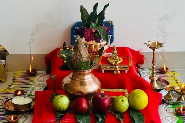 • A Sankalp is then taken, during which the deities are invoked and prayers are offered for the health, prosperity, and peace of the household.