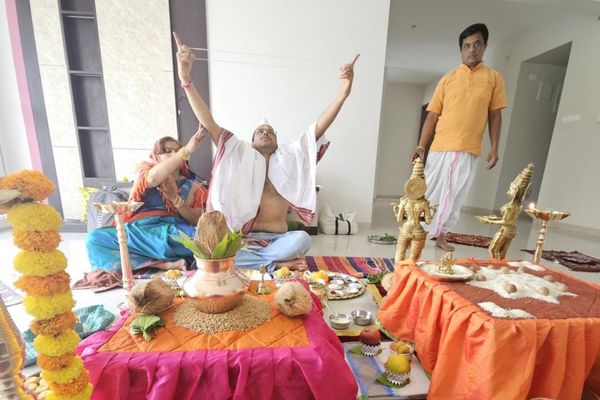 In this puja, water is ritually purified through Vedic mantras, and the sanctified water is then used to purify the entire house.
